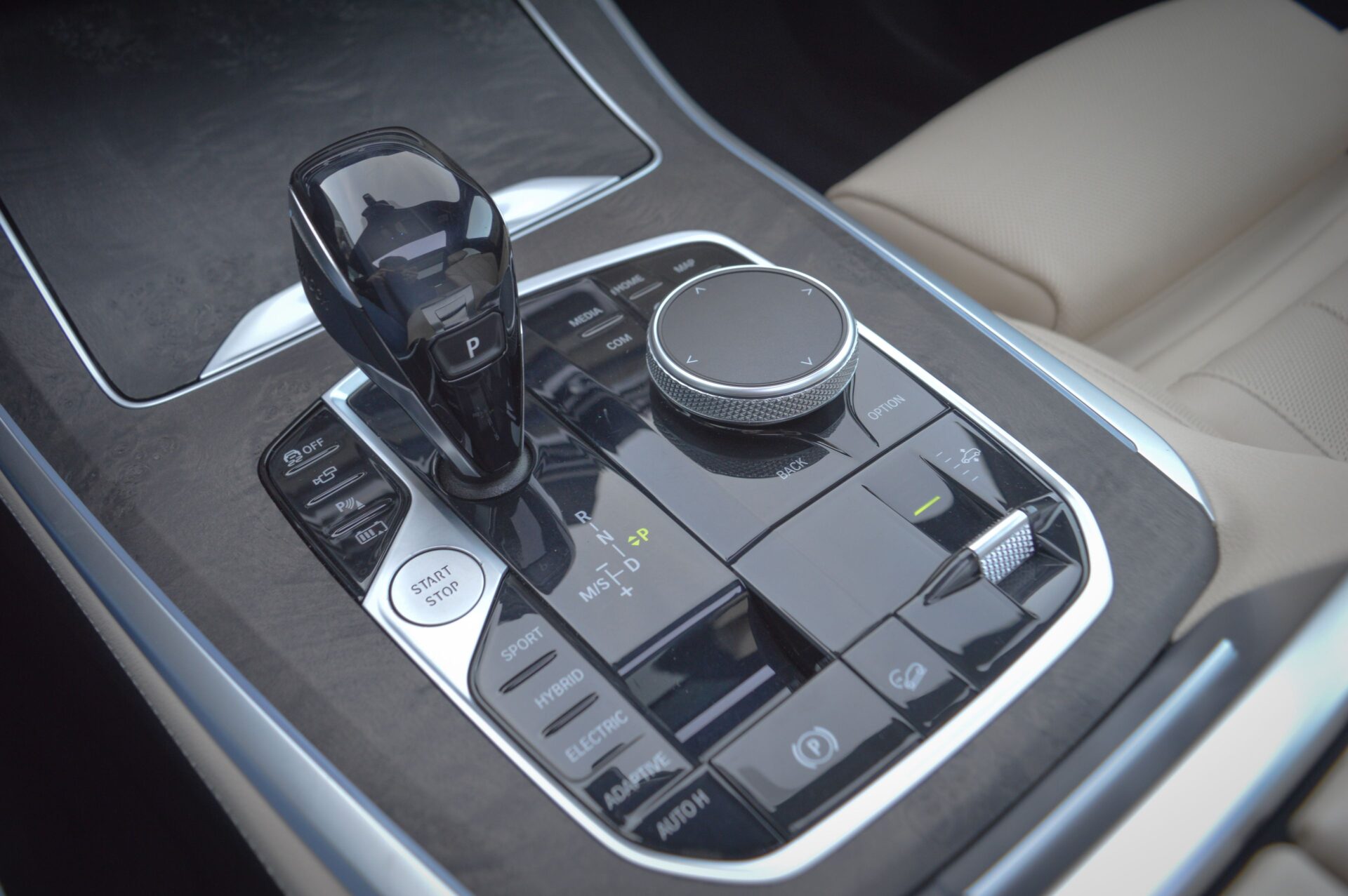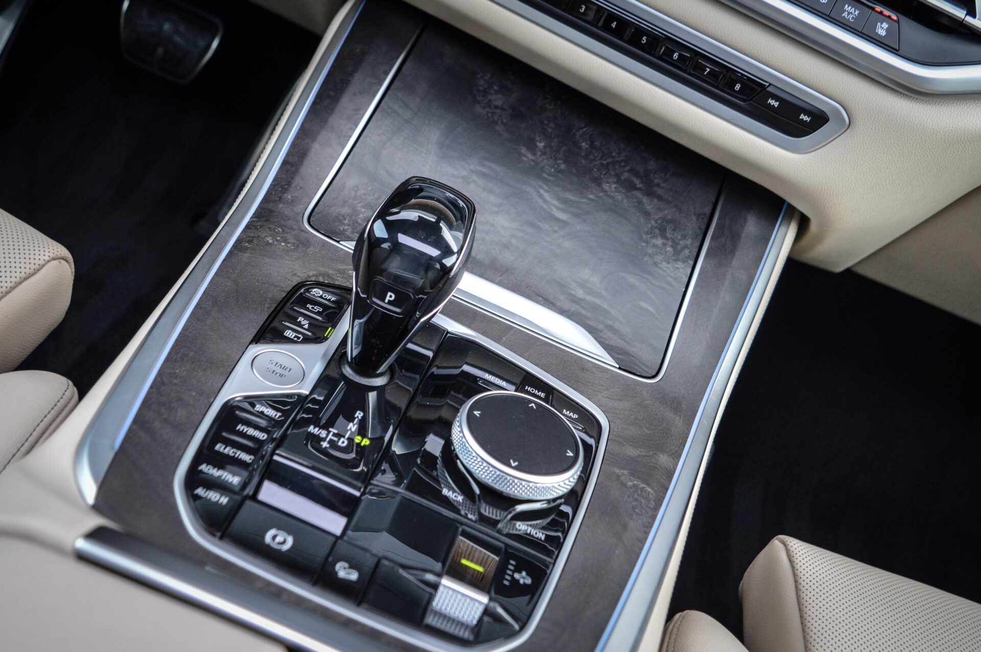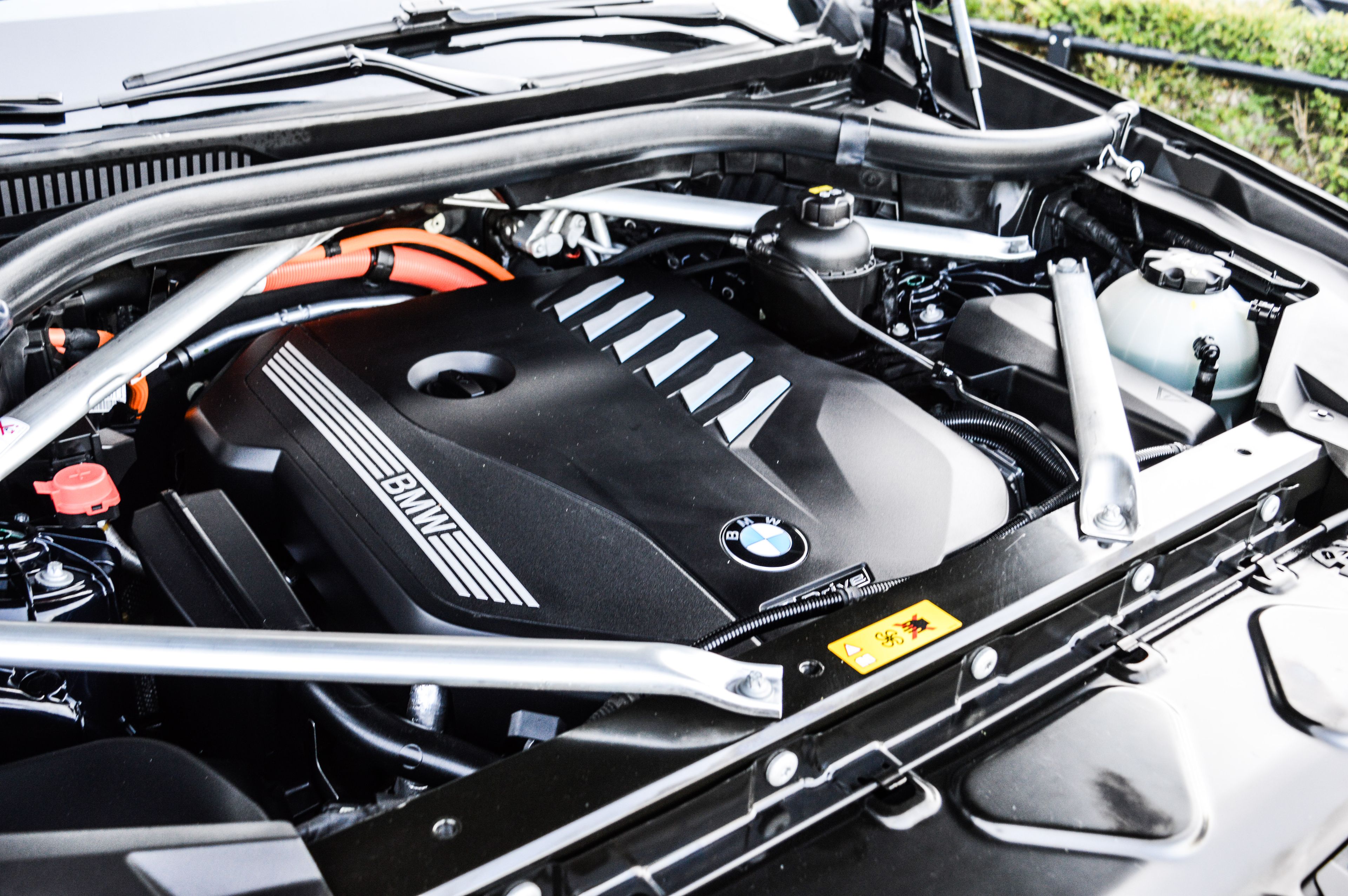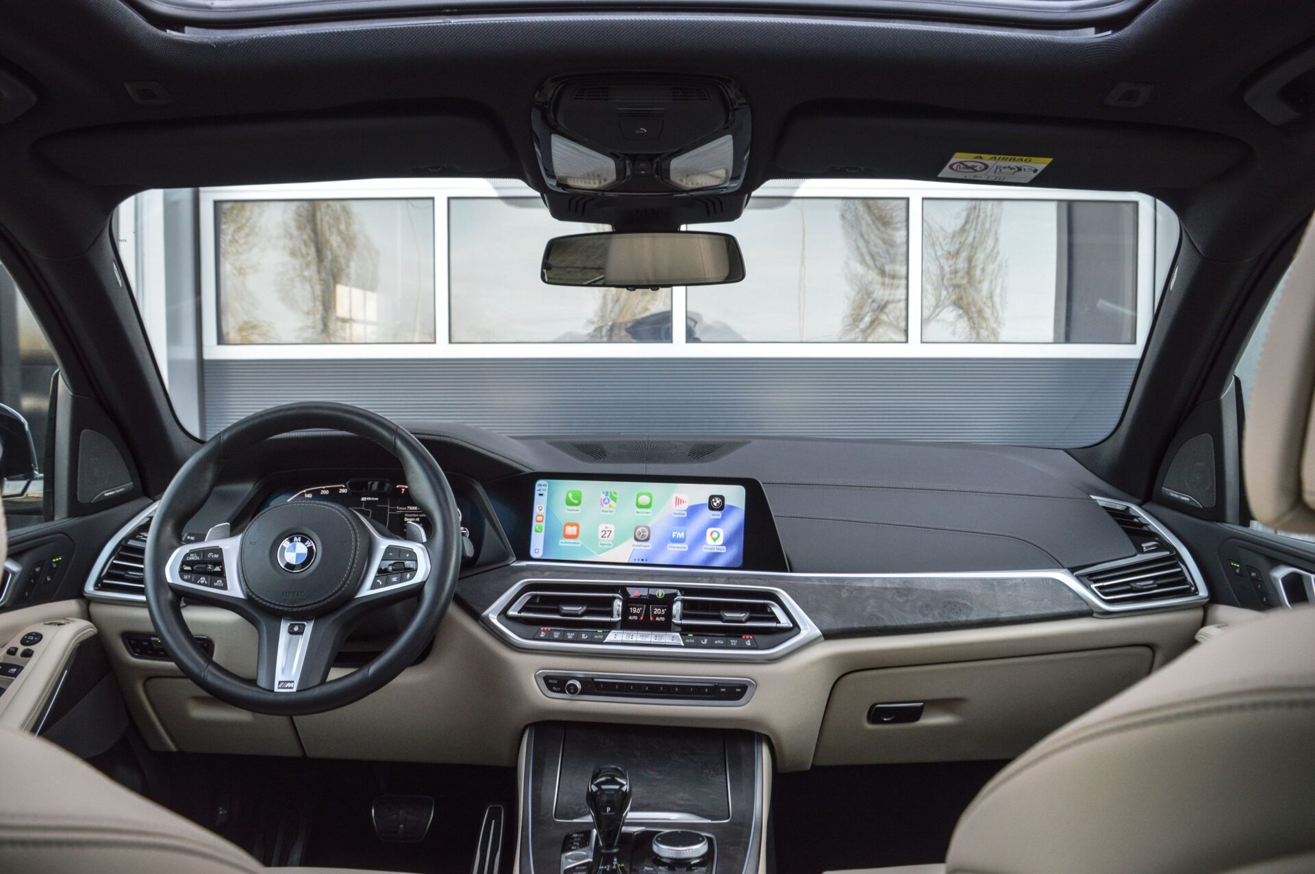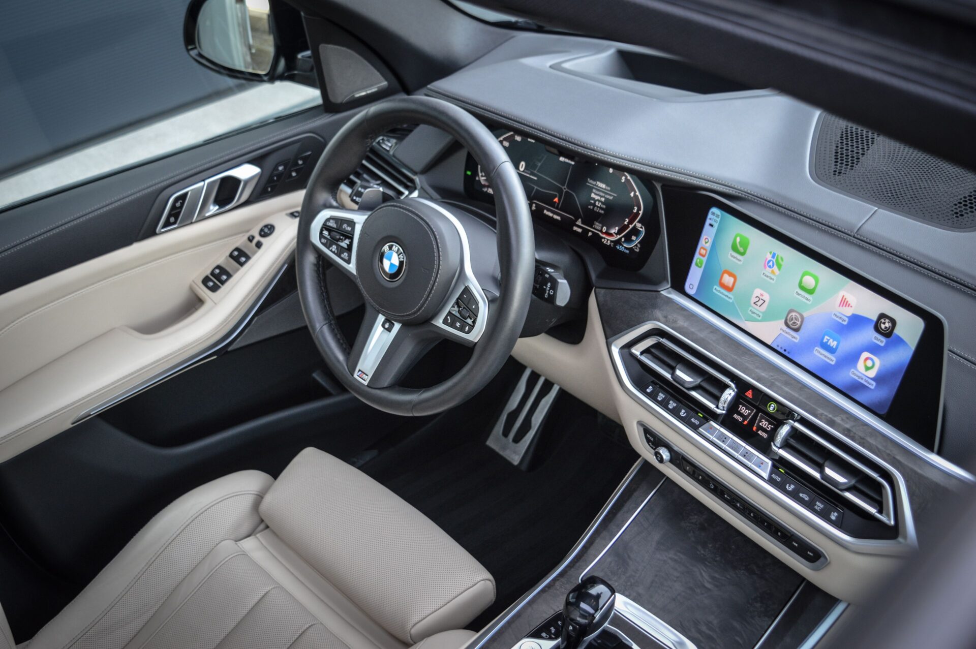 BMW X5 45E, 394PK, X-DRIVE, M-PAKKET, HIGH EXECUTIVE. De BMW X5 is full options uitgevoerd en geleverd in de Carbon zwart metallic lak en voorzien van het chique Vernasca Caberra Beige Lederen interieur.